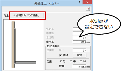 外壁仕上の属性ダイアログで「水切高」が非表示の場合