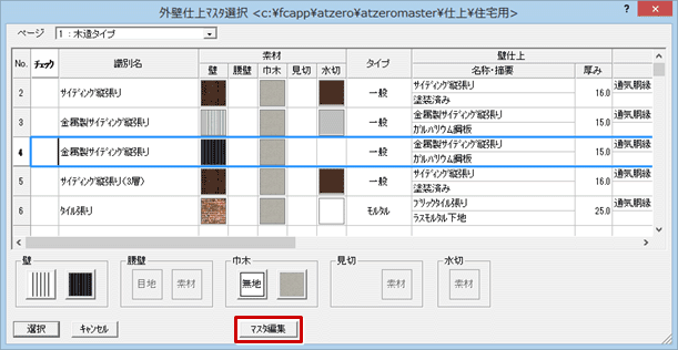 - 「外壁仕上マスタ選択」ダイアログで「マスタ編集」をクリックします。
