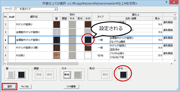 - 「外壁仕上マスタ選択」ダイアログで「選択」をクリックします。