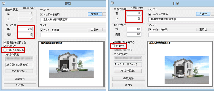 - 「印刷」ダイアログの「用紙に合わせる」をOFFにすると「イメージサイズ」の幅・高さを設定できます。「センタリング」をOFFにすると「余白の設定」の左・上を設定できます。