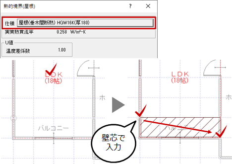 また、「境界」メニューの「熱的境界(屋根)」を使って、バルコニー部分に熱的境界(屋根)を入力することも可能です。