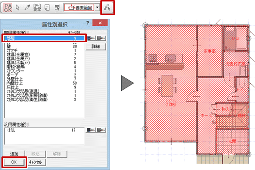 「属性別選択」をクリックして、「部屋」のみを選択します。