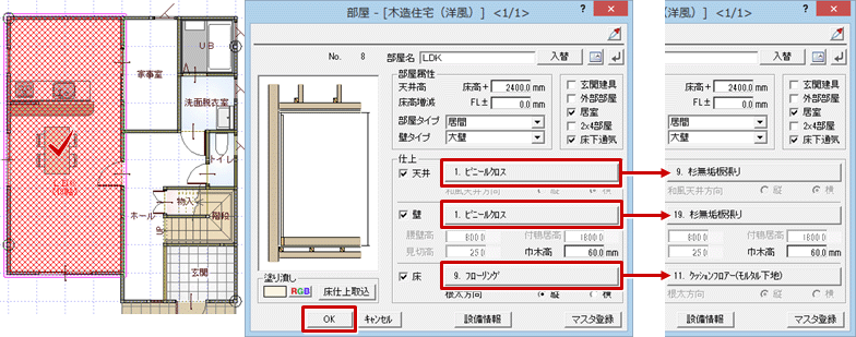 - 「部屋」ダイアログの「天井」「壁」「床」の各仕上をクリックし、仕上を変更して「OK」をクリックします。