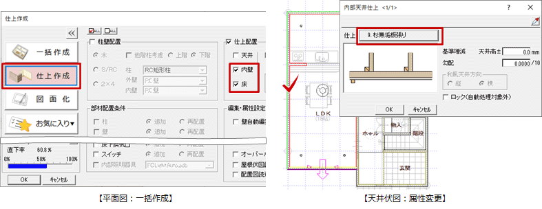 A:部屋の属性ダイアログで各仕上を変更して、「一括作成」ダイアログの「仕上作成」を行います。