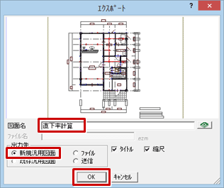 - 「エクスポート」ダイアログで、出力先の汎用図面について設定します。
