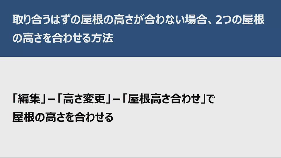 A:「編集」メニューの「高さ変更」の「屋根高さ合わせ」で2つの屋根の高さを合わせます。