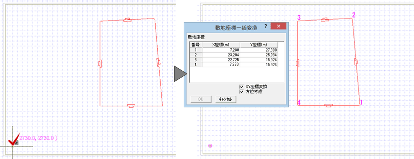 ※「敷地座標入力」で入力したときと同じ基準点を指定し、「XY座標変換」、「方位考慮」をONにすると、「敷地座標入力」で入力した座標を変更できます。