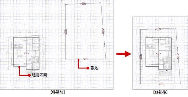 A:建物区画が敷地に含まれるように敷地を移動した後、「編集」メニューの「敷地移動」で距離を指定して敷地を移動します。