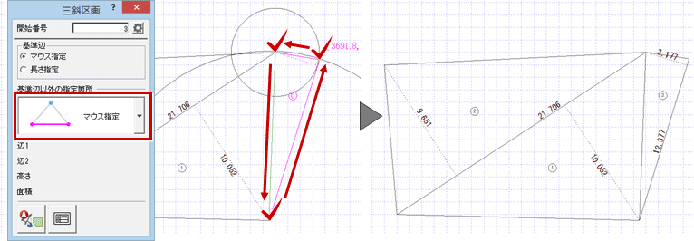 6. 「三斜区画」ダイアログの「基準辺以外の指定箇所」を「マウス指定」にして既存の三斜区画の角と、円の交点を順にクリックします。