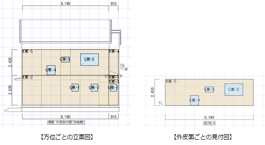 各方位ごとの外皮立面と外皮面ごとの見付図が自動作成されます。