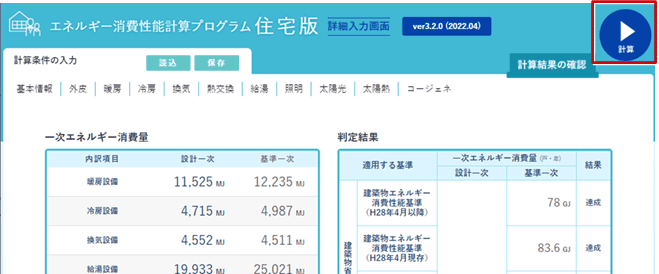 A:一次エネルギー消費量の算定には、国立研究開発法人 建築研究所の「エネルギー消費性能計算プログラム」をお使いください。外皮性能計算の入力データをXMLファイルに書き出して、「エネルギー消費性能計算プログラム」に連携することができます。