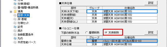- 「専用初期設定:屋根・天井」の「バルコニー仕様」で「屋根断熱」をONにします。