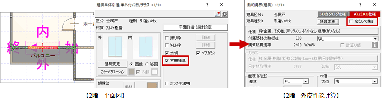 - 平面図で建具属性の「玄関建具」がONの場合は、外皮性能計算で「自動配置」や「ツール」メニューの「部材配置」を実行したときに「窓として集計」がOFFになります。
