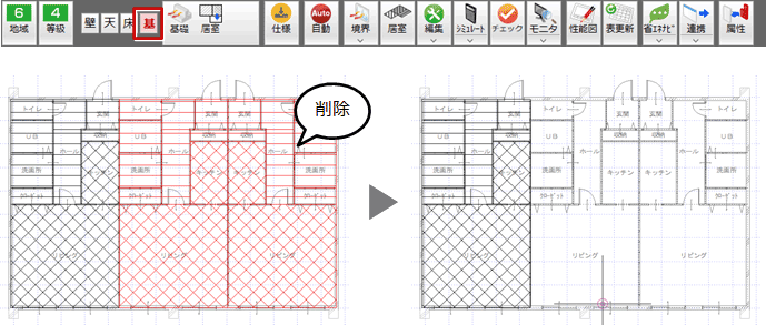 | 基礎・居室区画モード | ・ 熱的境界(基礎)、居室区画を削除 |
