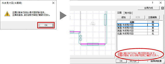 - 初めて外皮見付図を作成するときは、確認画面が開きます。確認画面で「OK」をクリックします。