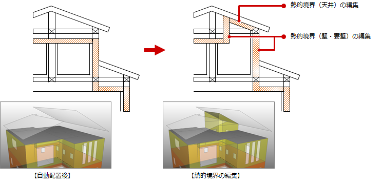 A:天井仕上の勾配は連動しません。勾配天井の面積は水平投影面積ではなく実面積を求めるため、熱的境界(屋根または天井)の編集が必要になります。また、通常の天井断熱との境目となる位置に熱的境界(壁・妻壁)の入力が必要になります。