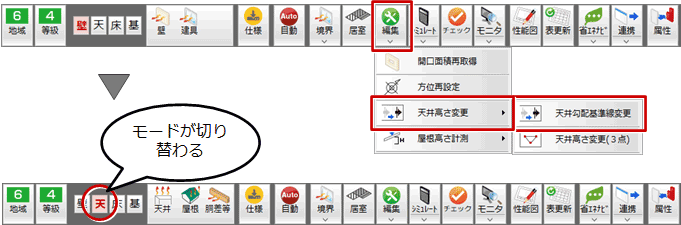 - 「編集」メニューから「天井高さ変更」の「天井勾配基準線変更」を選びます。