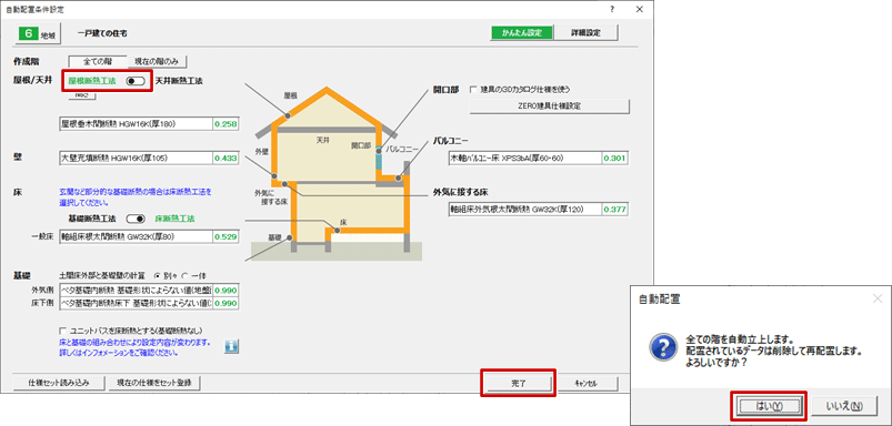 - 「自動配置条件設定」ダイアログで「全ての階」「屋根断熱工法」を選んで、「完了」をクリックします。