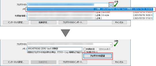 「ARCHITREND ZERO Ver8 体験版」のプロダクトIDを選択して「プロダクトID認証」をクリックします。