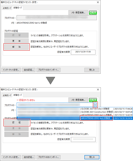 別の体験版のプロダクトIDを解除してから、「ARCHITREND ZERO Ver8 体験版」のプロダクトIDを認証してください。