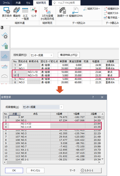 この場合、縦断ではXY座標を計算できないため、《路線測量》でプラス杭を追加して座標登録をおこない、《縦横断測量》で[路線データ取込み]をおこなってから地盤高入力して[登録]する手順になります。