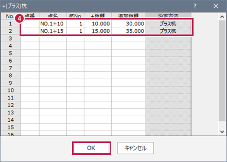 - プラス杭を追加するときは、縦断現況で設定した点名を入力して[OK]をクリックします。