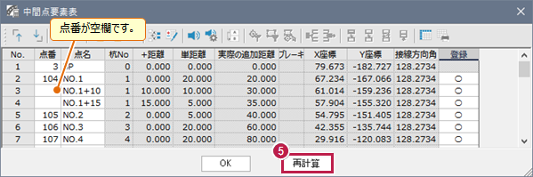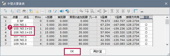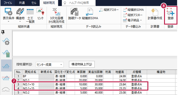 - プラス杭の測点が挿入されたことを確認します。(点種類も「登録点A」に変更されています)