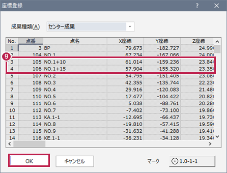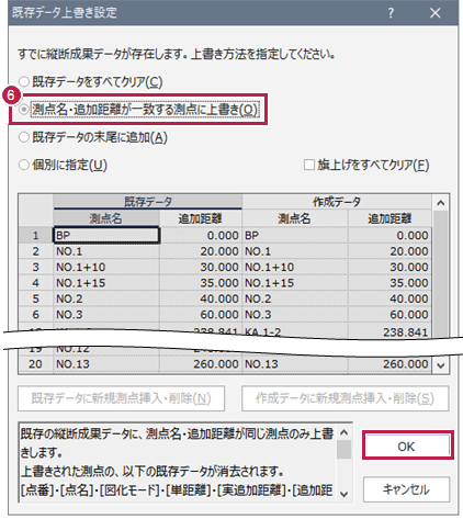 - 点名と距離が一致しているので、[測点名・追加距離が一致する測点に上書き]を選択して、[OK]をクリックします。※点名や距離が違うときは、[個別に指定]で行の挿入・削除でデータを調整します。