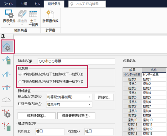 A:縦断野帳の観測時に、杭下観測をTPの前にするか後にするかの設定になります。[観測順]は路線で必ず統一してください。