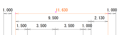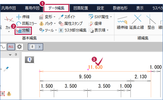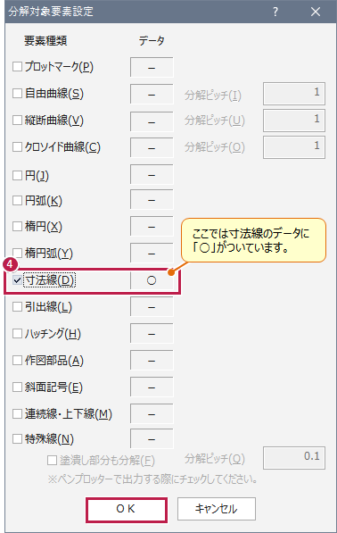 - 分解の対象となる要素にチェックをつけて「OK」をクリックすると、寸法線が線と文字に分解されます。