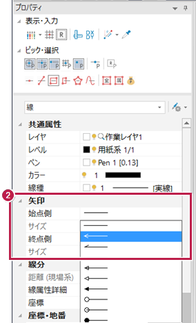 [プロパティ]-[矢印]にある[始点側]と[終点側]の矢印の種類とサイズを設定します。