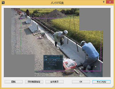 [保存範囲指定]ボタンをクリックすると[パノラマ写真]ダイアログが表示されますので、ここで写真の回転やトリミングをおこない、写真として保存する範囲を指定します。