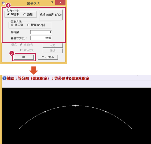 A:[入力]-[補助]-[等分割(要素指定)]で円弧選択後に始点を指定し、[入力モード][分割方法]を指定して「等分数」を「4」に設定してください。