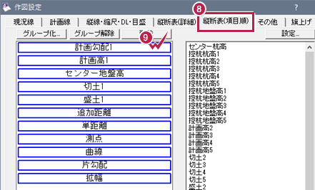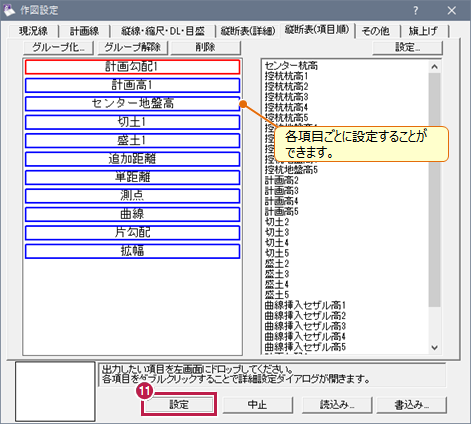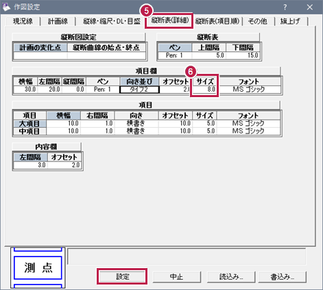 - [項目欄]の文字サイズを変更するため、[作図設定]の[縦断表(詳細)]タブをクリックします。