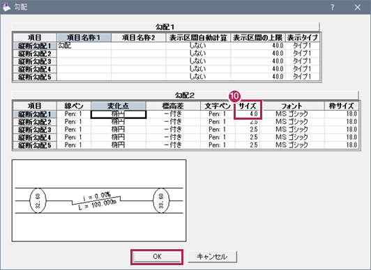 - 縦断表の項目内の文字サイズを変更するため、[作図設定]の[縦断表(項目順)]タブをクリックします。