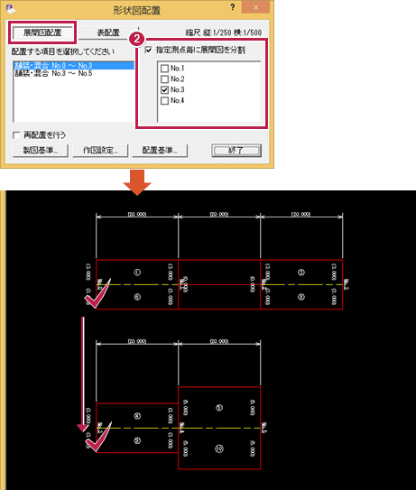 A:[舗装展開図]-[形状図配置]で、[指定測点毎に展開図を分割]にチェックを入れ、分割したい箇所の測点にチェックを付けて配置してください。