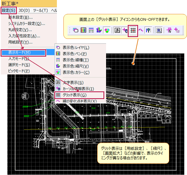 [グリット表示]がONのとき、自動的に[設定]-[ピックモード]-[グリッド]がONになります。線入力などでグリット線を選択したくない場合は[設定]-[ピックモード]-[グリッド]をOFFにします。