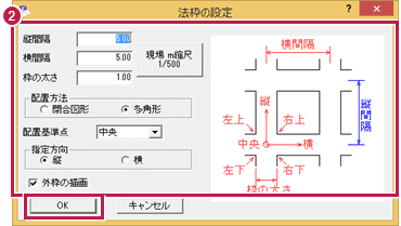 法枠の間隔、配置方法などを設定して[OK]をクリックします。