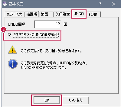 - [UNDO]タブで[ラスタコマンドのUNDOを有効化]をONにして、[OK]をクリックします。