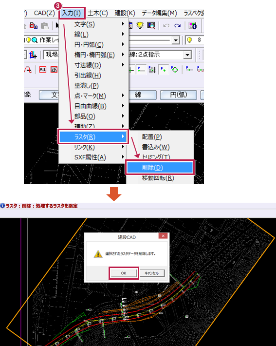 ここでは、[入力]-[ラスタ]-[削除]でラスタを消します。