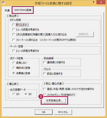 - [DXF/DWG変換]タブ-[文字変換比率]をクリックします。