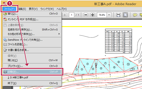 - PDFファイルを開き、[ファイル]-[印刷]をクリックします。
