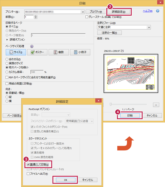 - [詳細設定]ダイアログで[画像として印刷]をONにして[OK]をクリックします。