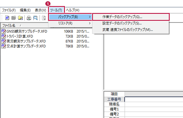 - [ツール]-[バックアップ]-[作業データのバックアップ]をタップします。