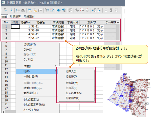 A:[地積図配置][測量図配置]の並び順になります。上から順に地番を入力して図面作成してください。