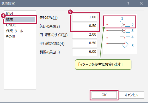 - [矢印の幅][矢印の高さ]を入力して、[OK]をクリックします。