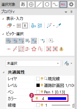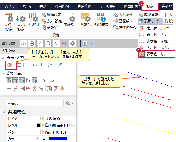 Q:《CAD》線や文字を選択して[カラー]の色を変更しても表示色が変わりません。どうしたらよいですか。