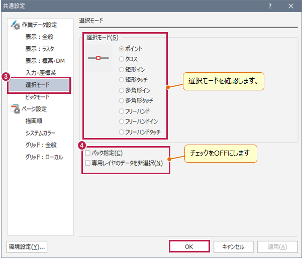 - [ポイント]などの選択モードを確認し、[パック指定][専用レイヤのデータを非選択]をOFFにして[OK]をクリックします。