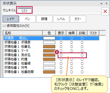 [レイヤ設定]や[形状表示]でレイヤの[検索]を空欄にすることで、編集できないようにロックをかけることができます。