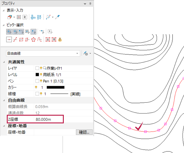 等高線をクリックして[プロパティ]-[共通属性]の[自由曲線]で標高(Z座標)を確認します。